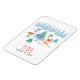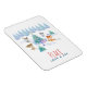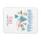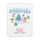 Magnet which has the saying: Peace Love & Joy. Designed with a whimsical Christmas scene. Happy forest animals dancing around a decorated Christmas tree.