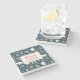 Stone coaster with a whimsical festive pattern. Polar bears, reindeers, trees. foxes, and snowflakes. On a dark green background. A rectangle frame with a faux gold foil border with peace love & joy, written inside.