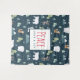 Tapestry with a whimsical festive pattern. Polar bears, reindeers, trees. foxes, and snowflakes. On a dark green background. A square frame with peace love & joy, written inside.