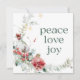 A green white double sided holiday card featuring a watercolor arrangement of greens and berries with peace love joy in green typography.