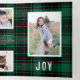 This beautiful tri-fold design features a dark green tartan plaid background and bold typography. The greeting on the front cover says simply "peace on earth" and continues inside with "love" and "joy". As you open the first panel you see a single square photo with your main holiday text. As you fully open the card you see one photo on the left, one photo on the right, and in the middle are three smaller square photos each with personalised text. The back of the card is blank but you could easily add another photo or more text. This design is a perfect choice for a warm, heartfelt message of Christmas joy. The multi-photo layout allows you to upload a total of SEVEN of your favourite family photos in various sizes.