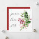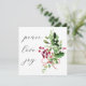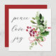A simple modern double sided holiday card in colours of green and white with a watercolor of a bouquet of holly berries and assorted winter greens and peace love and joy in handwritten script typography. The reverse side has a holiday message and your names which are easily personalised.