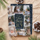 Beautiful typography based holiday photo card features eight of your favourite family photos arranged in a collage layout. "Wishing you peace, love and joy" appears in the centre in gold foil hand lettered typography on a midnight blue background dotted with festive stars. Personalise with your family name beneath.