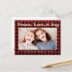 Design is composed of red and black plaid/tartan pattern. Add a custom photo of you with the rest of your family. The photo is adorned above with unique gold greetings.