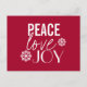 Peace Love Joy Red Snowflake Holiday Postcards: Use these cute and adorable postcards to send to your friends and family during the holiday season. Use the prompt to completely customise the product. If you wish to change the graphic, please contact me through my store or by email: theantiquechandelier@gmail.com AntiqueChandelier© http://www.antiquechandelier.ca