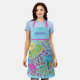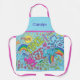 You can personalise this all over print apron with your name. It is inspired by vintage 1960s art. It has a bright and colourful design including the words Peace, Love and Joy, decorated with sunshine, rainbows, music notes, flowers and stars in lots of happy colours, with co-ordinating tie colours. Look carefully, and you will find Hugs too! It makes a great present for an adult or child.