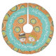 Peace Love Joy Snowmen holiday tree skirt features a beautiful design of snowflake orbs on orange, a ring of solid aqua blue, and a ring of orange with white polka dots with some pretty matching snowflake orbs and a cute snowman couple! White text reads Peace*Love*Joy! This beautiful Christmas tree skirt will be treasured for years to come!