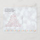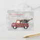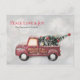 A cute Christmas postcard. Personalise with your name. Text says: Peace Love & Joy. Image is a cute little toy truck with Merry Christmas hand painted on the side. Carrying a decorated Christmas tree in the back. The background is a festive silver bokeh pattern. Personalised message on the back.