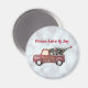 A holiday magnet with a cute christmas design. Text says: Peace Love & Joy. Image is a cute little toy truck with Merry Christmas hand painted on the side with gold lettering. Carrying a decorated Christmas tree in the back. The background is a silver bokeh pattern.