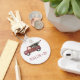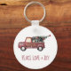 A festive Christmas keychain. Text says: Peace Love & Joy. Image is a cute little red toy truck with Merry Christmas hand painted on the side in gold lettering. Transporting a decorated Christmas tree in the back.