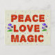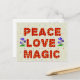 Brightly coloured orange, red, and yellow letters with hearts spell out the words "Peace Love Magic," and are surrounded with a rainbow of stars and purple mushrooms.