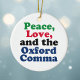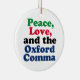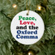 Peace, Love, and the Oxford Comma. A hilarious punctuation Christmas ornament gift with proper use of the Oxford comma. This funny grammar joke will be a hit with an English literature teacher or writer.