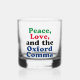 Peace, Love, and the Oxford Comma. A hilarious punctuation whiskey glass with proper use of the Oxford comma. This funny grammar joke will be a hit with an English literature teacher or writer.