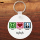 Adorable panda bear in a blue square next to a green peace sign and a red heart on a beautiful animal keychain. I love cute pandas. Peace Love Panda keychain with your personalized name.