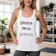 Channel calm with this modern “Peace • Love • Patience” graphic print scoop neck tank top. Perfect for activewear and rest days, the motivational charcoal text is simple, uplifting, and versatile enough for any style esthetic.