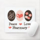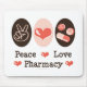 Peace symbol, heart and assorted prescription pills in pink and dark brown on cute and hip pharmacy t-shirts, apparel and more gifts for a pharmacist, PharmD professor, pharmacy school student or grad, pharmacy tech, cpht or rph.
