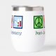A cute phlebotomist gift featuring a peace sign, heart, and blood vials. Peace Love Phlebotomy wine tumbler.