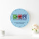 Peace Love Physical Therapy personalised wall clock with a green peace sign, red heart, and the letters PT in blue for a physical therapist. Customise this cute office decor gift with your company or business name.