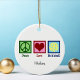 Peace Love Pickleball Christmas ornament gift for a pickle ball player featuring a cute peace sign, heart, and a yellow ball for the sport.