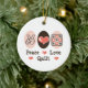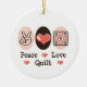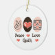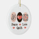 Peace symbol, heart and fabric quilting square with hearts and flowers in pink and dark brown on quilt t shirts, apparel, clothing and more merchandise make a cute gift for the avid quilter.
