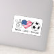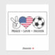 This vinyl sticker is great for a USA soccer fan. The design features a peace hand sign, an American flag in the shape of a heart and an soccer ball with the words "Peace Love Soccer".