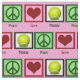 Cute pink tennis player fabric covered with peace signs, hearts, and tennis balls. Peace Love Tennis pattern.