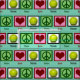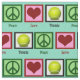 Teal tennis fabric covered with peace signs, hearts, and tennis balls.