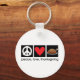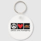 Celebrate Thanksgiving with this festive holiday key-chain that reads, "peace, love, thanksgiving" with illustrations of a peace sign, heart and whole roast turkey on a platter.