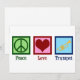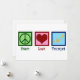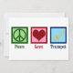 A cute marching band holiday card featuring a peace sign, heart, and the instrument. Cool Christmas cards for a trumpeter that reads Peace Love Trumpet for a brass player.