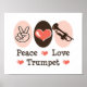 Trumpet player shirts, stationery and more apparel and merchandise with a peace symbol, heart and trumpet in pink and dark brown. A cute marching band, jazz musician, brass instrument, music geek or symphony and orchestra gift for a trumpet player and his or her family.