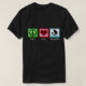 A black tee featuring a heart, peace sign, and a windsurfer.