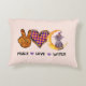 This playful Halloween throw pillow features the phrase “Peace, Love, Witch” with three bold icons: a hand flashing the peace sign, a purple and orange chequered heart, and a witchy black cat curled inside a crescent moon. With vibrant colours and spooky-chic energy, it’s the perfect blend of retro fun and magical charm—ideal for witchy vibes all season long.