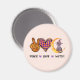 This playful Halloween magnet features the phrase “Peace, Love, Witch” with three bold icons: a hand flashing the peace sign, a purple and orange chequered heart, and a witchy black cat curled inside a crescent moon. With vibrant colours and spooky-chic energy, it’s the perfect blend of retro fun and magical charm—ideal for witchy vibes all season long.