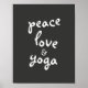 A motivational typography quote poster in bold white text on charcoal grey background with peace love and yoga is available for wall art decor for home or office.