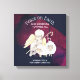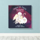 A christian themed canvas art print. Designed with a sweet angel with yellow wings holding a shepherds crook. Sitting with white fluffy lambs. Navy blue and burgundy watercolor background, with tiny flecks of faux gold sparkle glitter (not actual glitter just a printed image). Text says: peace on earth and goodwill towards all, and wishing you a very Merry Christmas