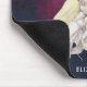 A christian themed mousepad. Designed with a sweet angel with yellow wings holding a shepherds crook. Sitting with white fluffy lambs. Navy blue and burgundy watercolor background, with tiny flecks of faux gold sparkle glitter (not actual glitter just a printed image). Text says: peace on earth and goodwill towards all.