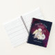 A christian themed personalised spiral notebook. Designed with a sweet angel with yellow wings holding a shepherds crook. Sitting with white fluffy lambs. Navy blue and burgundy watercolor background, with tiny flecks of faux gold sparkle glitter (not actual glitter just a printed image). Text says: peace on earth and goodwill towards all.
