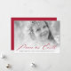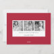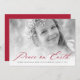 Elegant and simple holiday photo card features your favorite horizontal or landscape oriented photo in full bleed, with "peace on earth" overlaid in red classic calligraphy script lettering. Personalize the front of the card with your names or a short holiday message, and add three additional photos to the back along with a custom personal message. For a blank back, simply delete the photo templates and white matte layer. NOTE: This card is designed to convert your photos to black and white. To revert to color, select "click here to customize further" beneath the text and image templates, and remove the Black & White filter.