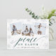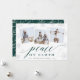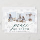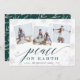 Elegant holiday photo card features three square photos in a collage layout, with "Peace on Earth" overlaid in rich hunter green script and block lettering with subtle snowflakes in the background. Personalise with your name(s) and the year beneath. Cards reverse to a spruce green and cream botanical patterned background. A modern and minimalist choice printed on crisp white cardstock with black lettering.