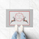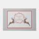 Modern and festive holiday themed doormat features pair of reindeer with hand drawn Peace on Earth red leaf wreath on grey background