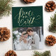 Elegant Christmas card featuring "Peace on Earth" displayed at the top in a hand-lettered gold foil script with your name and photo displayed below on a green background. The back of the gold foil Christmas card features a pattern of white pine branches and dots with a green background (or colour of your choice).