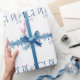 Christmas wrapping paper with a message: Peace on Earth in large blue font. An Arctic Fox stands on the "A."