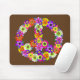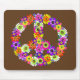 A floral peace sign in shades of pink, yellow, orange, purple, green, white and black.
