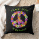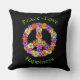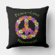 This throw pillow features a floral peace sign in shades of pink, yellow, orange, purple, green, white and black. Available in a variety of sizes and fabrics.