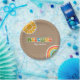 Groovy baby shower theme featuring peace sign incorporated into "Welcome" text with custom text for name. Sunshine at top left and rainbow at right over cardstock inspired sunburst background.