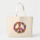A floral peace sign shades of pink, turquoise, yellow, orange, purple, green and black adorns this trendy tote bag.