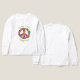 This t-shirt features a floral peace sign in shades of pink, yellow, orange, purple, green, white, black and turquoise. "Peace, love and happiness" surround the peace sign.