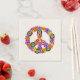 This paper napkin has a floral peace sign in shades of pink, turquoise, yellow, orange, purple, green and black.