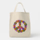 A floral peace sign shades of pink, turquoise, yellow, orange, purple, green and black adorns this trendy tote bag.