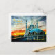 An elegant blue mosque at sunrise is the inspiring image to wish "Eid Mubarak' at the Muslim / Islamic holy days of "Eid al Adha" or "Eid al Fitr" after the Fast of Ramadan. The Islamic mosque is in hues of blue against a blazing red and orange sky.